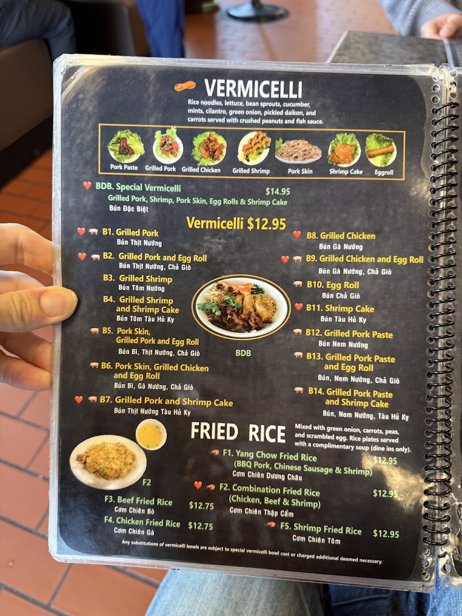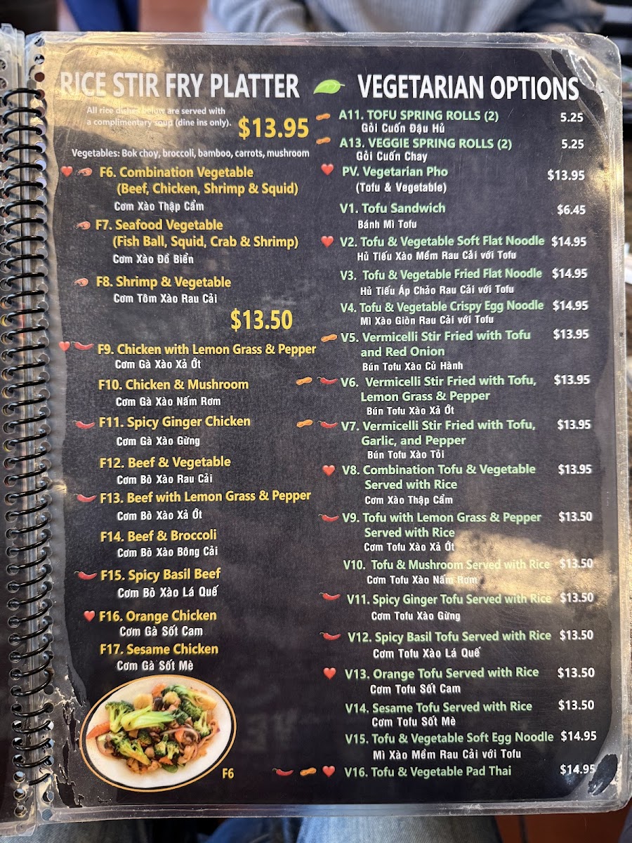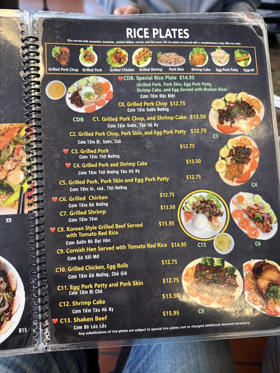 Beyond pho, the menu shines with its Spicy Chicken Curry, customizable with bread, egg noodles, rice noodles, or vermicelli—a delightful fusion of spice and comfort. The rice plates evoke traditional flavors, featuring charbroiled pork, shrimp cake, and fresh vegetables paired perfectly with broken rice.